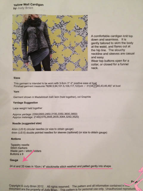 For the past four weeks I’ve been knitting happily away on a new cardigan for myself, “Yellow Wall Cardigan”. I replaced the recommended yarn with a very nice tweedy yarn, Rustic Tweed by Queensland Collection, and I was loving the result, although I occasionally wondered if the stitches were tight enough. Now, it’s drummed into all knitters from the second they pick up their first size 10 needles and ball of acrylic yarn that before they start a project, CHECK YOUR GAUGE! Because every knitter has her/his own specific tension on how they hold their yarn, the number of stitches per inch that each knitter achieves with the same size needle and the same yarn can vary greatly. And, if you use a different yarn from the one recommended in the pattern, it’s doubly important to do a proper swatch. For example, if you are knitting a sweater with a, let’s just say, 37″ width at the chest and the pattern requires, let’s just say, 24 stitches per inch, and you are knitting 22 stitches per inch, it would change the width of the sweater to 40″. That’s right, three inches, a full size larger – you see where I’m going with this?