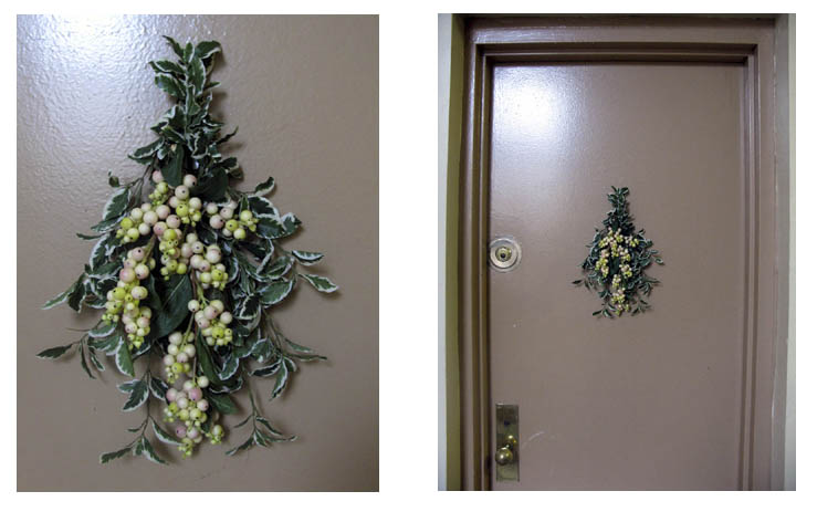 In fact, why should our door should be welcoming and cheerful only at Christmas? So off I went this week to my favorite fabric flower store on 28th Street, Pany Silk, and found a nice combination of flowers and leaves that I wired together to replace the holiday flowers and bring in the new year.